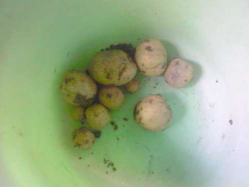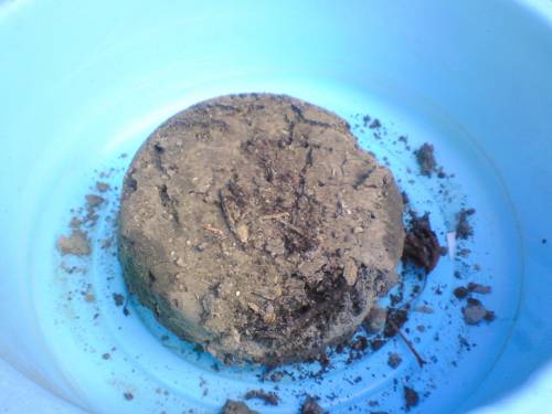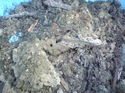 他の写真は、かなり昔に収穫し忘れたジャガイモとキャベツ苗を育てているポット、栄養分の高い土を作るためにミミズを飼っていたバケツをひっくり返したものです。残念ながらミミズはどこかへ・・・・土のかたまりには空洞が空いていて確かにミミズが住んでいたはず・・・・