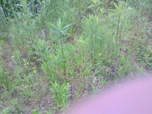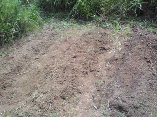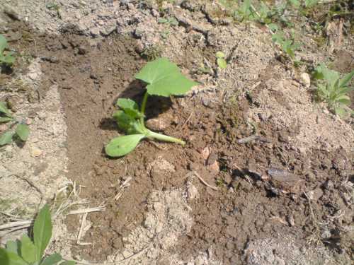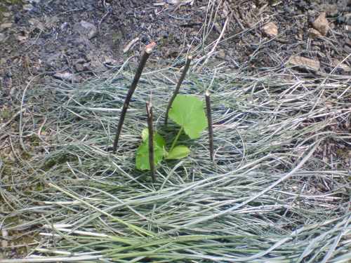 カボチャの苗を定植してからちょっと様子見。うまく根が付いたのでしょうか、枯れることなく青々しています。毎朝の水やりが効いているのでしょう、さらに天気も曇りがち、絶好の定植環境なのかも。水やりの水分がすぐに蒸発しないように、刈った草を苗の周りに敷いてやりました。あと、お呪いのように立てた枝、これも日中苗に陰を作ってくれる優れものです。以上2点は、祖母のアドバイスであります。
