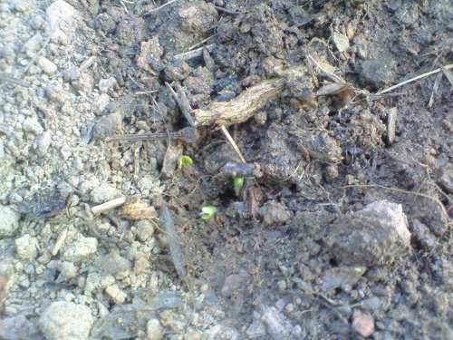 実は、キャベツ様に作った畝にもキャベツの種が蒔かれていたりします。そいつらも次々に発芽開始です。ポット分のキャベツ苗を植える畝を急遽作らねば・・・・