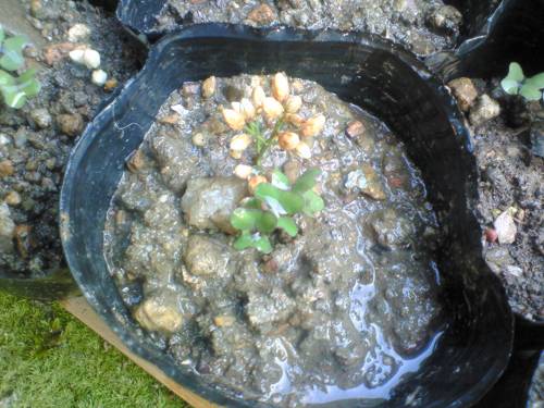 ポットのキャベツの芽が順調に数を増やし、成長しています。芽が出てから余りポットを真剣に覗いてなかったのですが、ある日の夕方帰ってきてポットの中を覗いてみると見たことのないものが生えておりまして、しかも既に蕾も付けてるじゃないですか。早速嫁さんに報告したら、娘がどっかから拾ってきて土に指したものであると、まんまと騙されました。横で4歳の娘が笑っておりました。