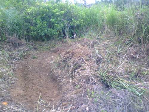 キャベツ用の畝を無理矢理作ってやりました。雑草の残骸(根っこ、茎など)が混じっていたりして、状態は良いとは言えませんが、キャベツ苗を植えるスペースが必要だったので・・・左手前に一列と奥側に一列。