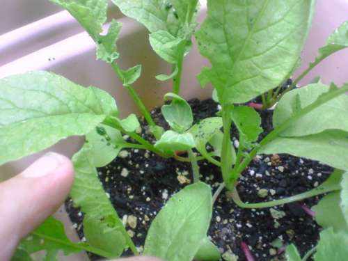 畑の枝豆と自宅プランターのラディッシュ(嫁さん管理)も育ってます。ラディッシュは、青虫発生してますね。