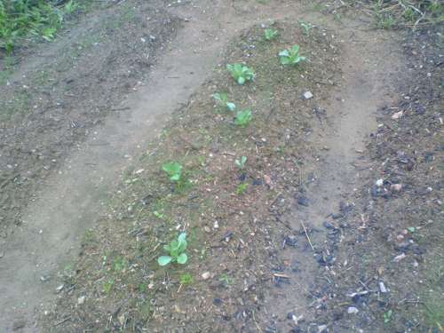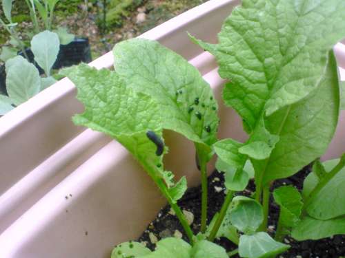 定植した苗ですが、事件が発生。もう青虫が出てきています。しかも、小さい苗で葉っぱが少ないので速攻食い尽くされています。青虫も考えて食べてほしいです。食い尽くしたら自分食べるものなくなるのに・・・