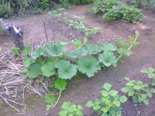 一寸見ない間に、カボチャは逞しく育っております。蕾らしき物もチラホラ見えてきました。キャベツも頑張っています。追肥効果でグングン行ってもらいたい物です。