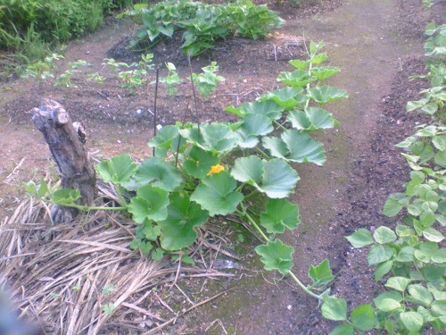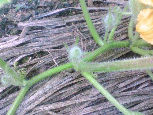 カボチャは蔓も伸び続々と蕾を付けて育っています。しかし気になるのは、どれもこれも雄花であることです。カボチャなどの蔓植物は、雄花・雌花があって当然、雌花が実になると言うことです。残念ながら、雌花はまだのようです。