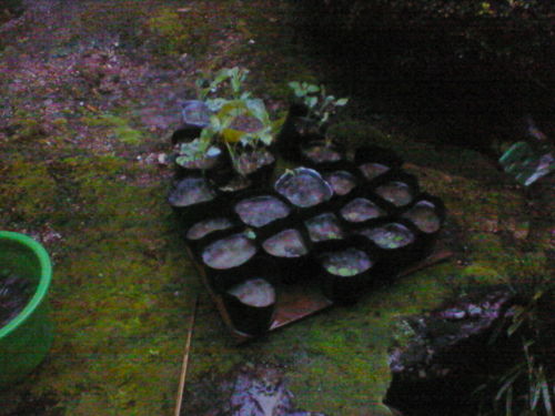 昨夜の雨で、ポットが沈没しました。昨日植えた、チマサンチュの種が・・・・ま、何とかなるかな。キャベツ苗の残りはどうなってもかまいません。青虫予報用に自宅前で栽培しているだけです。どういう訳か自宅前のキャベツに青虫が出始めると畑のキャベツにも青虫が出始めます。毎朝チャックすると便利です。