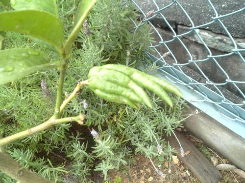 祖母の畑に、菩薩の手?とか言うメデタイ?柑橘類?が実りました。一応パチリ。柑橘類っぽいのですが、真ん丸の実ではなく先が指のように分かれているのです。うちのはちょうど5本指、一般的には5本ではなくもっと沢山に分かれるようです。