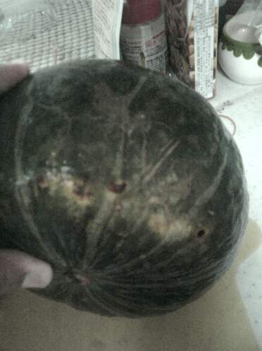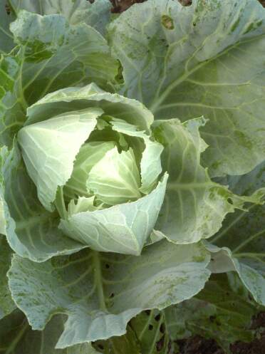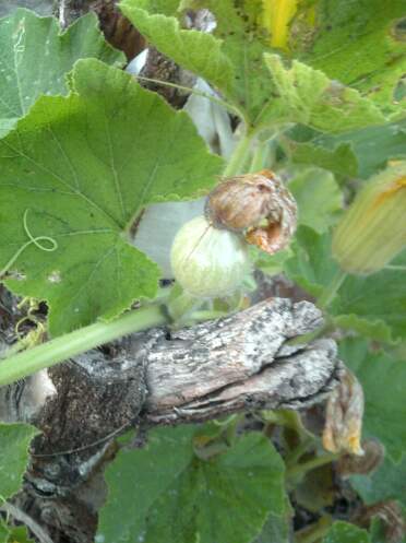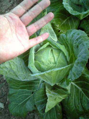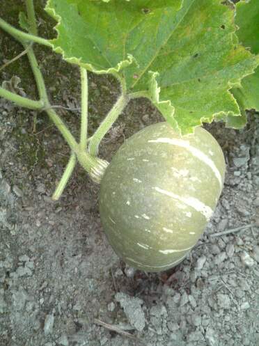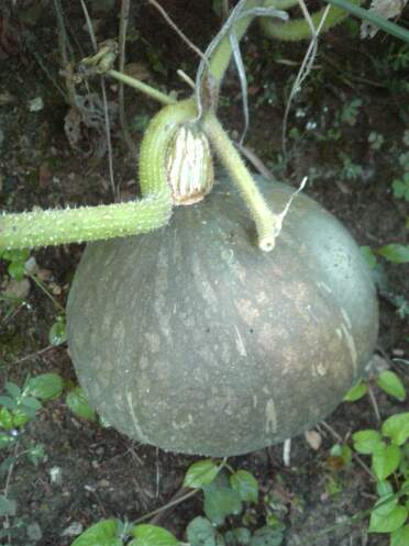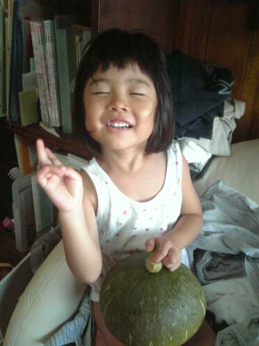 キャベツの玉も結構大きくなってきています。自分の手と比べてみても良い感じに育っています。カボチャはこんな奴です。普通のカボチャとチョイと形が違いますね。種に書いてた名前は忘れましたが、非常に甘いらしいです。順調に育っていますので、虫に食われた奴を収穫してみました。4歳小柄な娘の頭より少し大きいでしょうか、良く育ってます。