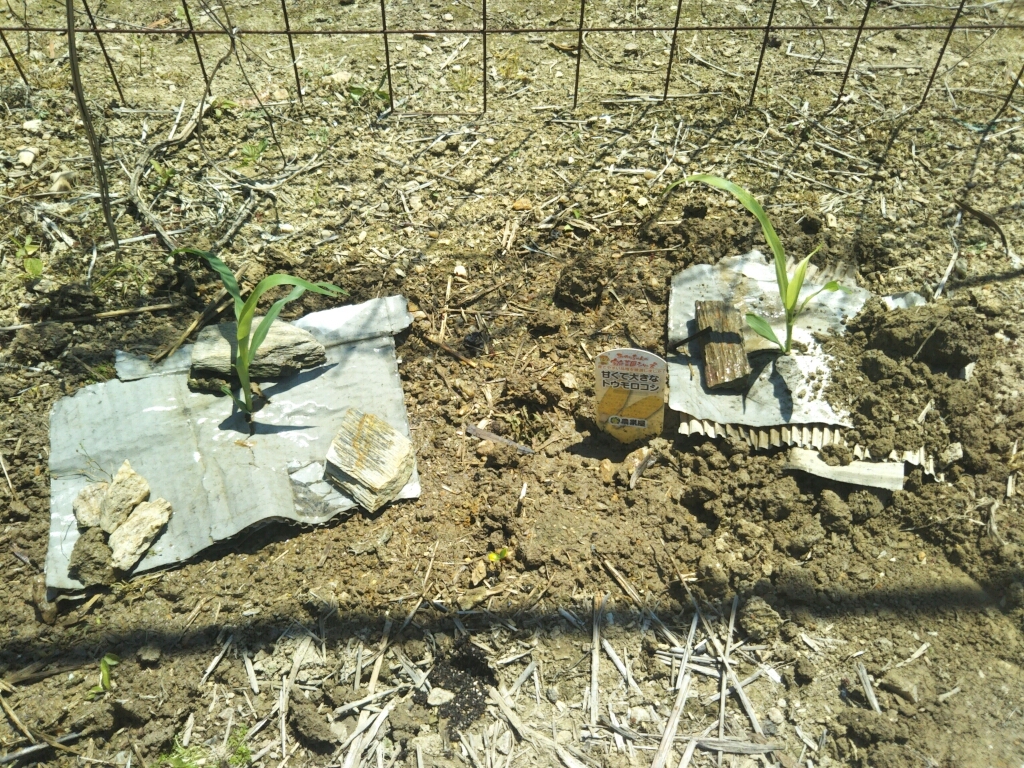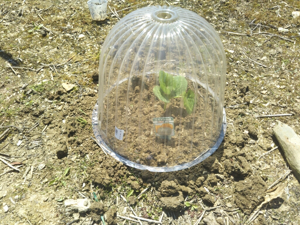でございます。カボチャ、スイカには半球状のケースをかけ暖を取ってやります。トウモロコシには、