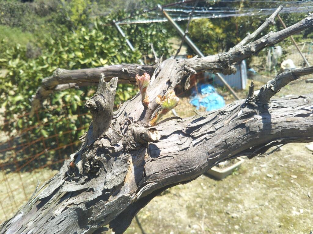 ブドウの新芽も出てきました。ブドウは世話が大変なので、消毒とか袋掛けとか、たぶんまた