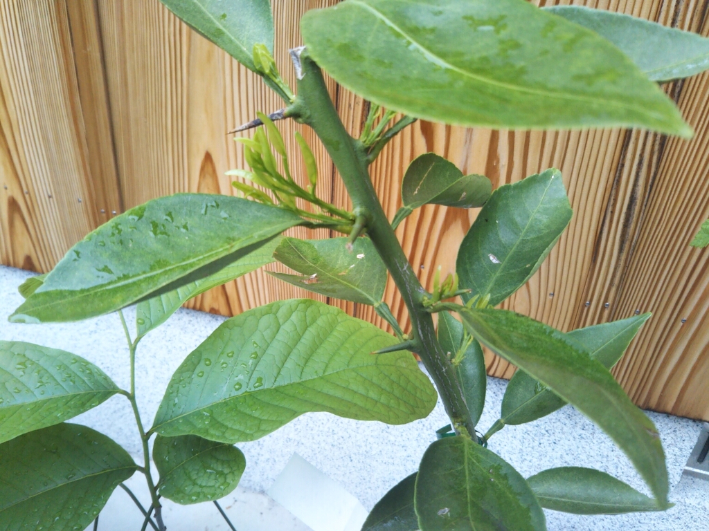暖かくなって、鉢植え蜜柑の苗にも新芽が出始めました。蝶々が飛んでますので