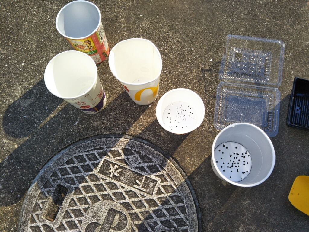 お菓子の空箱に排水用の穴をあけただけのものであったり、飲み物のコップであったりリサイクル品です。
