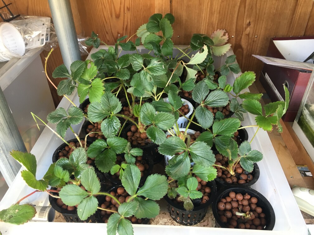 イチゴ(水耕栽培)、スモモ(鉢植え)の様子