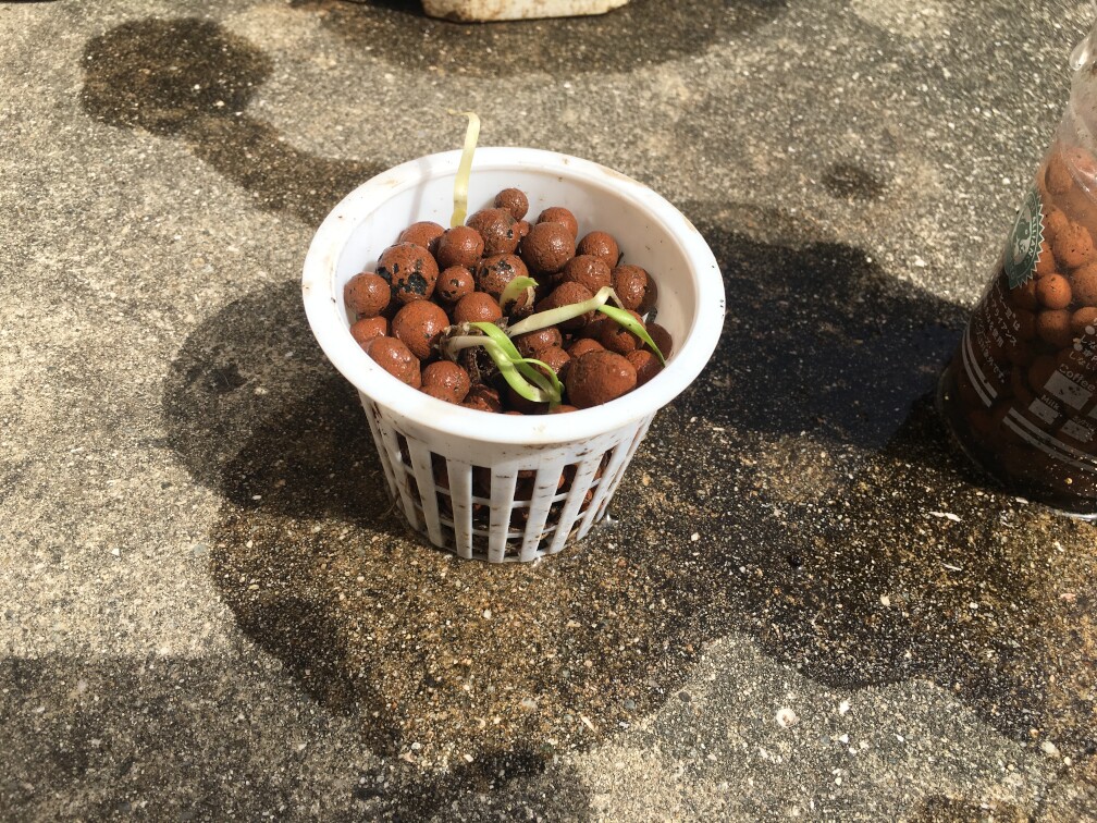 ここでもいつもの、水耕栽培用のポットにハイドロボールを満たして株を植えます。あとは、水につけておくだけです。省エネ運用目指してます。