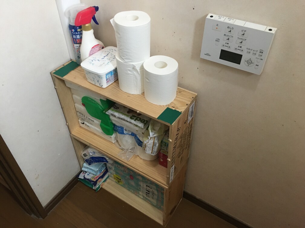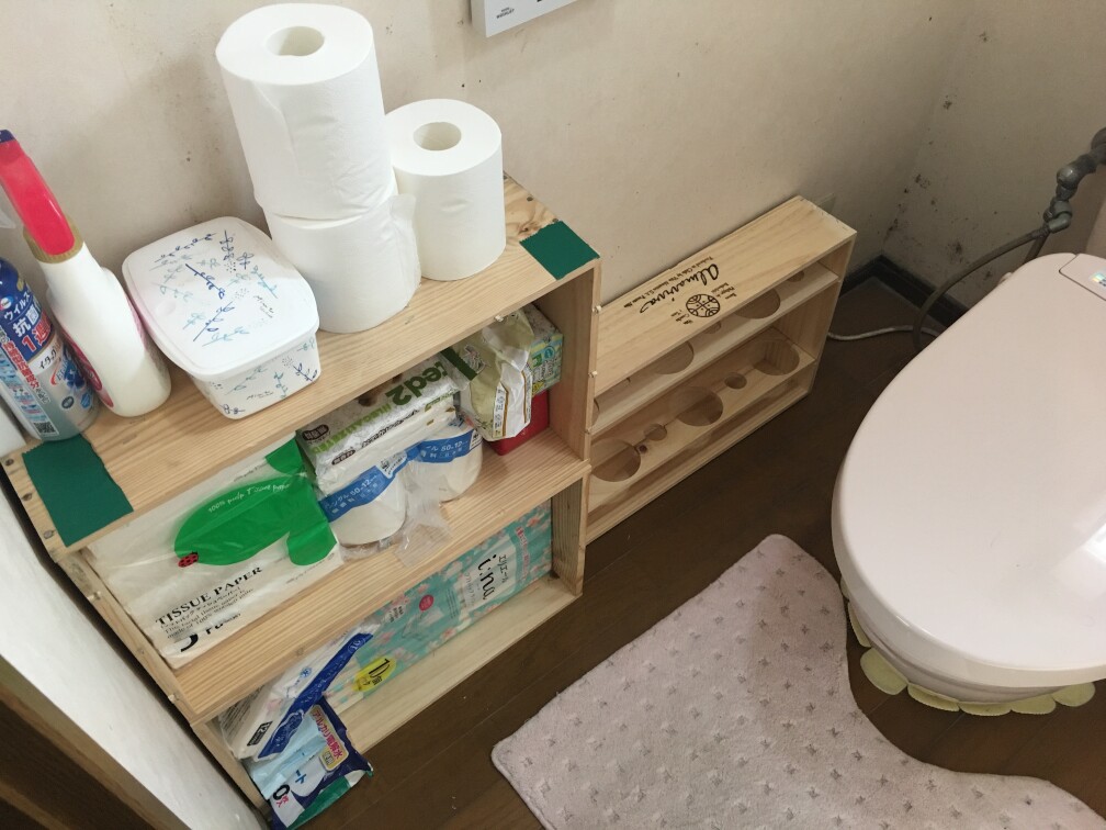 何もしないDIYですが、とりあえずトイレの小物収納にと購入しましたのでトイレに運んで並べてみました。トイレって結構ゆったりしてて物を置いてしまいがちなんですよね。で、床に並べるとむさ苦しいというわけで、今回のワインボックスです。