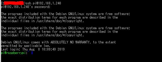って入力するとパスワード聞いてきますので、ユーザーpiのパスワードを入力するとログイン完了です。